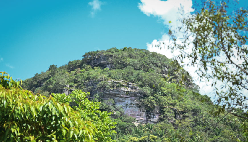 Con una extensión de más de 12.000 hectáreas, la Serranía de La Lindosa se erige imponente en medio de la selva guaviarense. Forma parte del escudo Precámbrico de Suramérica y sus afloramientos rocosos, conocidos como tepuyes, albergan una biodiversidad con características únicas. Sus rocas han conformado un paisaje único caracterizado por cárcavas –barrancos profundos–, túneles y puentes naturales, y en ellas se originan caños de aguas cristalinas y rojizas (por óxidos), que fluyen hacia el río Guaviare, creando hábitats acuáticos inigualables.